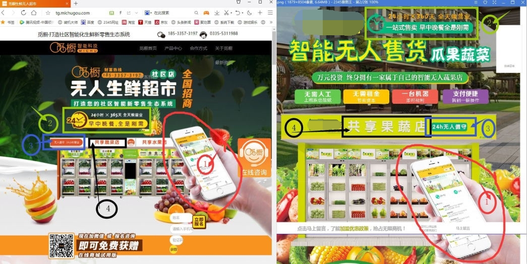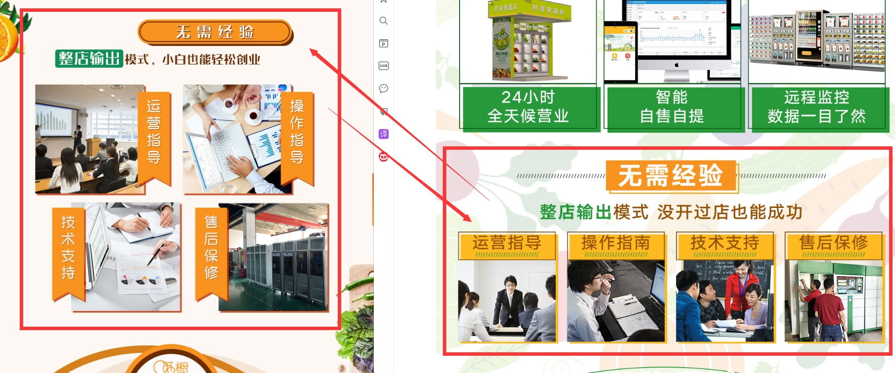 (左側為覓櫥優鮮共享果蔬店原創購物步驟圖;右側為某品牌盜版購物步驟圖)