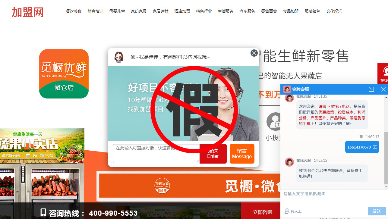 從2020年上半年到現在,全國各地出現了許多效仿覓櫥共享果蔬店項目的“跟風者”,覓櫥也展現了對追隨者極大的包容。但近期網絡上一些“追隨者”不僅拿著覓櫥的運營物料做自己品牌虛假的宣傳推廣,甚至直接打著覓櫥品牌的旗號開始迷惑、欺騙客戶。其慣用伎倆是:在網絡上大肆宣傳覓櫥的品牌,然后以覓櫥的名義獲取客戶相關信息,然后再與客戶溝通的過程中,再試圖對客戶的項目意向強行轉化,轉化成與覓櫥果蔬店項目相關的其他品牌項目,或是與覓櫥項目根本毫無關系的其他項目。這種行為不僅嚴重擾亂社區無人售貨市場,更是以惡劣的手段對廣大客戶進行迷惑、欺騙的行為。